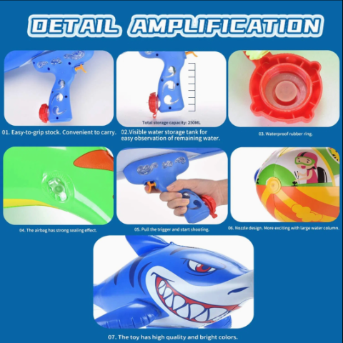 Designul său captivant de rechin albastru, cu ochi pătrunzători și dinți zâmbitori, adaugă o notă de fior la fiecare bătălie de apă.