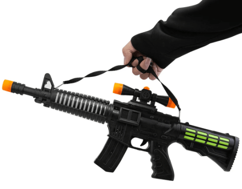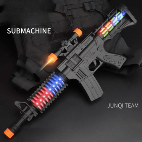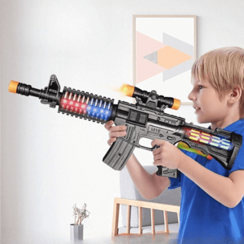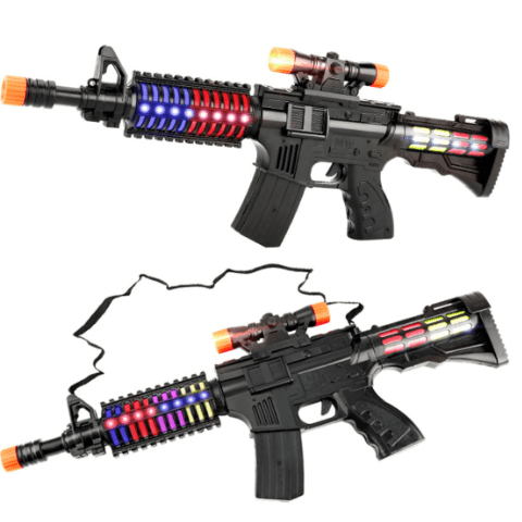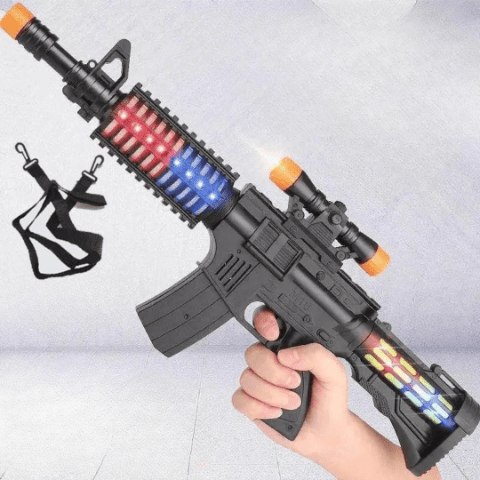 Pușca de jucărie cu design realist și lumini LED multicolore oferă copiilor o experiență de joacă plină de acțiune.