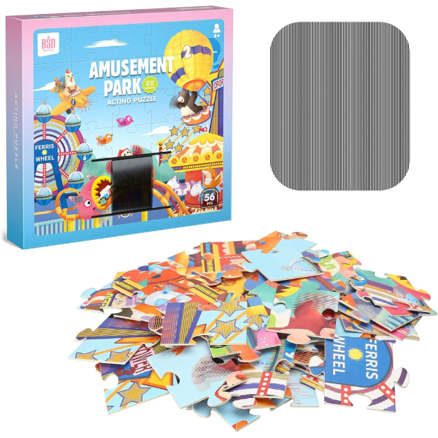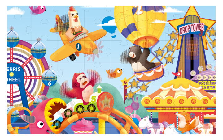 În momentul în care puzzle-ul este complet, imaginea colorată și vibrantă ilustrează scene vesele cu personaje simpatice care participă la diverse atracții din parc.