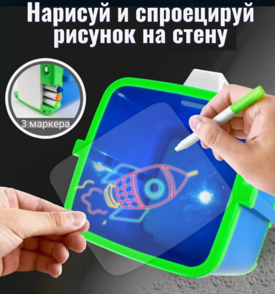 Setul include trei markere neon și un bloc de desene, gata să fie personalizate și proiectate pe pereți sau tavan.