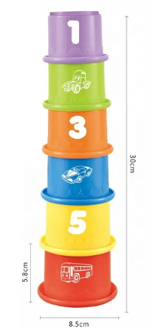 Paharele viu colorate, inscripționate cu cifre, sunt ideale pentru activități de stivuire, dezvoltând coordonarea mână-ochi și abilitățile motorii fine.