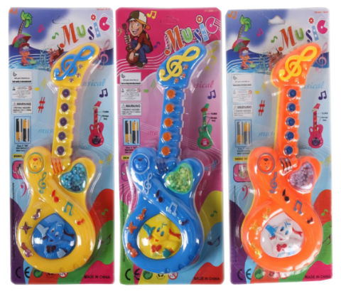 Fiecare chitară este decorată cu simboluri muzicale și o inimioară plină de mărgele vibrante, captivând atenția copilului.