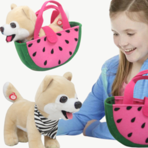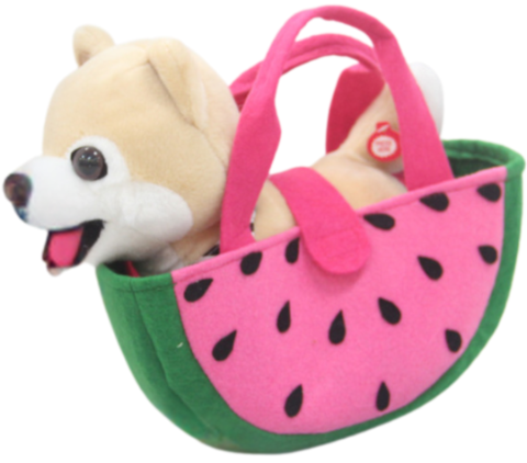 Acest adorabil cățeluș de pluș vine cu o geantă veselă în formă de pepene și este pregătit să aducă bucurie copilului tău.