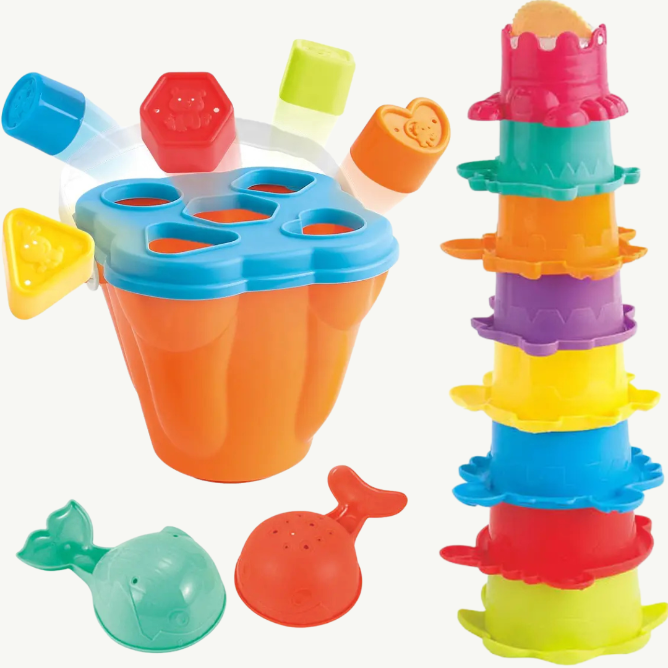 Cupa cu forme geometrice captivante îndeamnă copilul să învețe despre potrivirea formelor în timpul băii sau pe plajă.