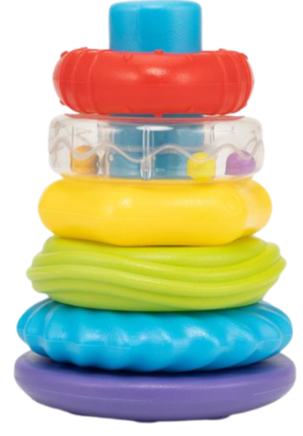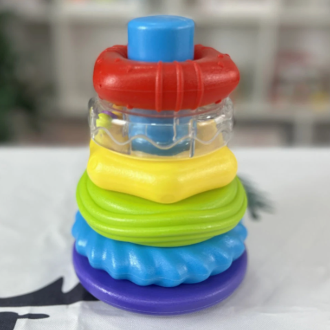 Setul include inele viu colorate și texturate, de diferite dimensiuni, care pot fi stivuite pe un suport stabil.