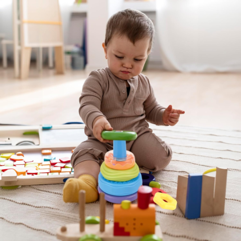 Această piramidă cu inele colorate este o jucărie esențială pentru dezvoltarea abilităților motorii fine și a coordonării mână-ochi.