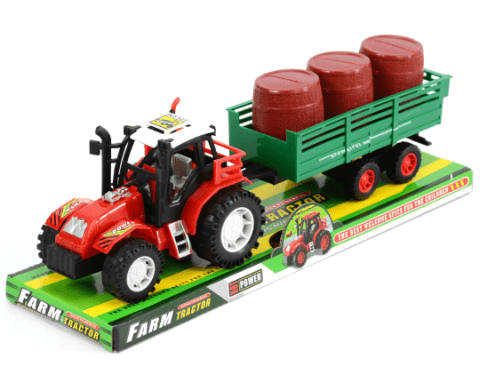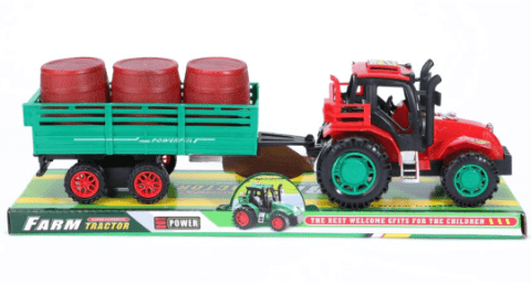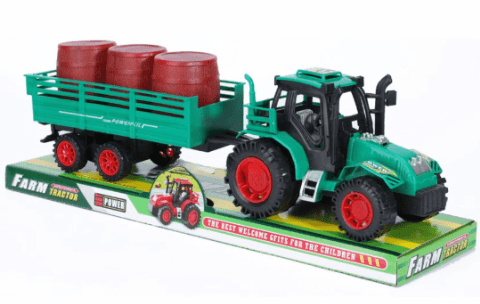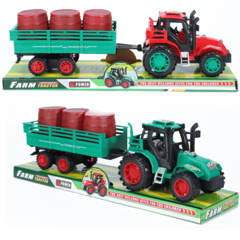 Un tractor de jucărie robust, cu remorcă detașabilă și 3 butoaie mobile, perfect pentru micii fermieri.