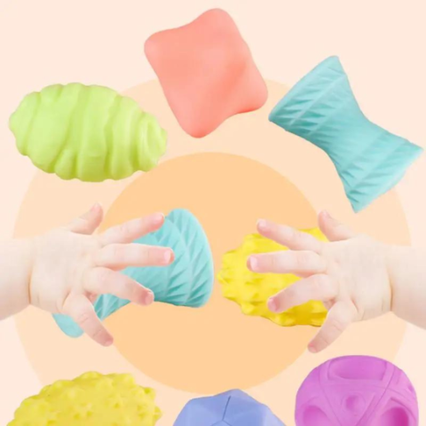 Setul include 6 mingi de forme și culori variate, potrivite pentru bebeluși începând cu vârsta de 18 luni. Jucăriile sunt ușor de curățat și sunt gândite să încurajeze curiozitatea și joaca activă, contribuind la dezvoltarea simțului tactil și a coordonării mână-ochi.