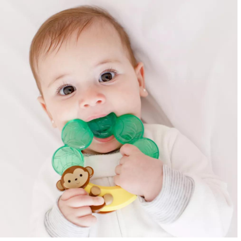 Maimuțica simpatizantă, concepută pentru dentiție, oferă alinare gingiilor iritate, fiind ușor de ținut de mâinile mici.