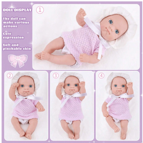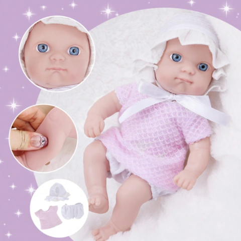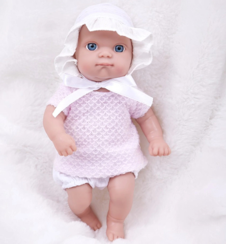Cu ochi albaștri mari și o piele moale, păpușa emană delicatețe și puritate.