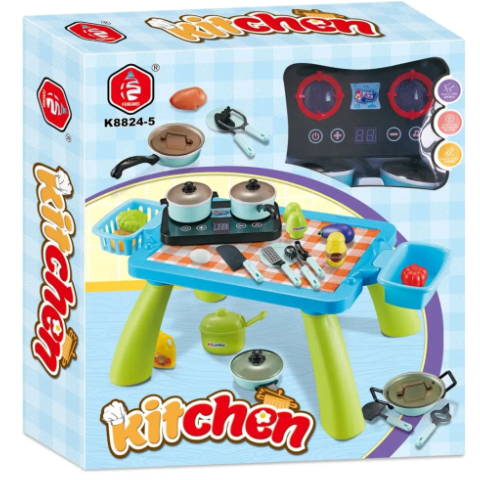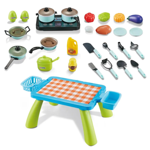 Masa robustă, cu un design colorat și vesel, este echipată cu aragaz și spații de depozitare laterale pentru un plus de realism.