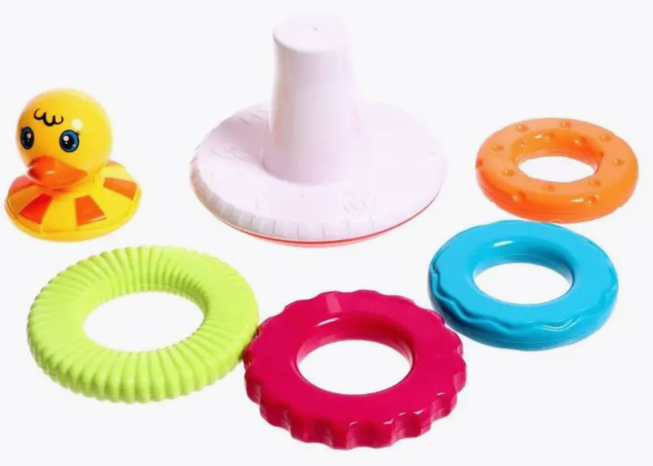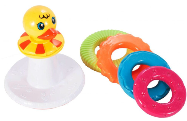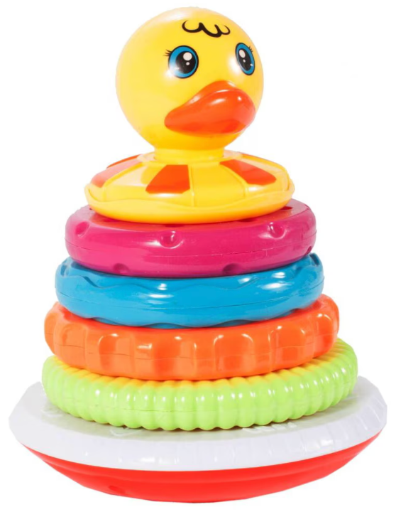 Inelele din plastic viu colorat sunt ușor de prins și de stivuit, iar rața simpatică din vârf completează jucăria cu un element distractiv.