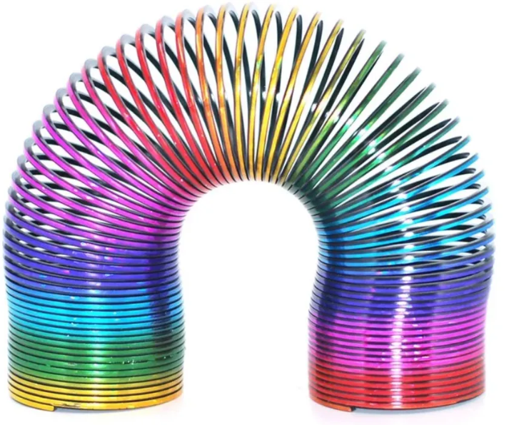 Jucăria antistres „Slinky” curcubeu cu aspect metalic aduce o explozie de culoare și mișcare în jocurile copiilor și adulților.