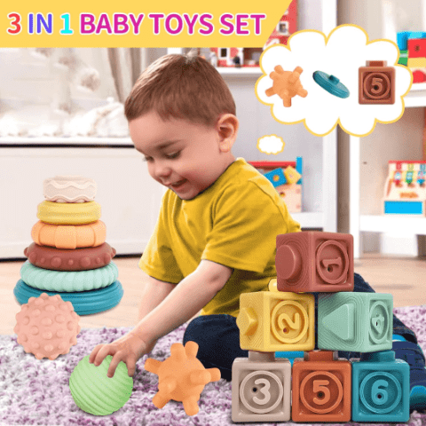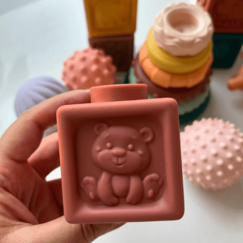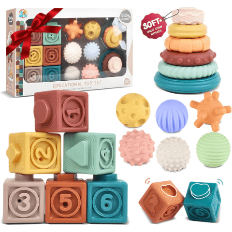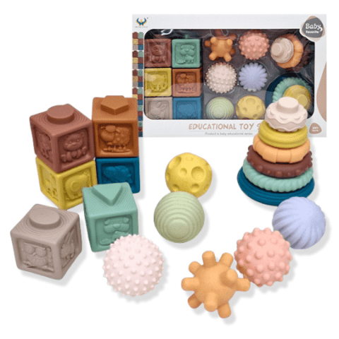 Setul include cuburi moi cu forme, cifre, animale și fructe în relief – perfecte pentru explorare vizuală și tactilă.