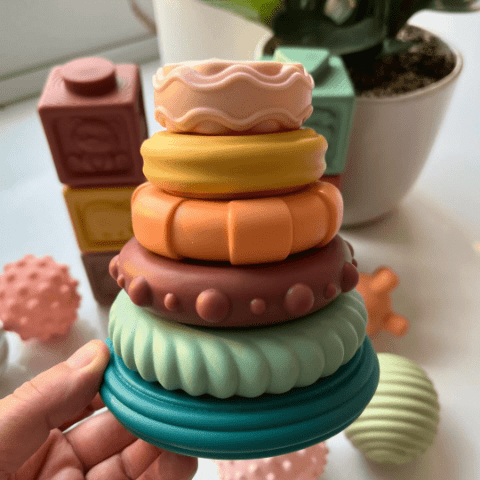 Inelele colorate din material moale pot fi stivuite în ordine crescătoare, dezvoltând coordonarea și logica bebelușului.