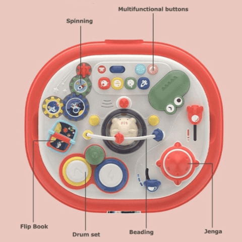 Panoul superior este plin de butoane, rotițe, tobe, glisante și alte elemente tactile care dezvoltă coordonarea mână-ochi și motricitatea fină.
