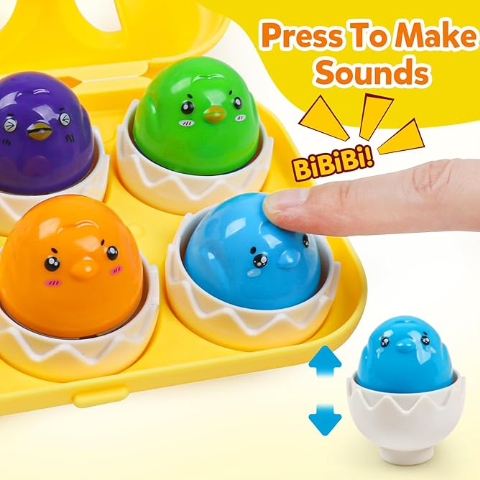 Apăsând ouăle, acestea emit sunete amuzante care îi vor captiva pe cei mici și le vor stimula curiozitatea și dorința de a explora mai mult.