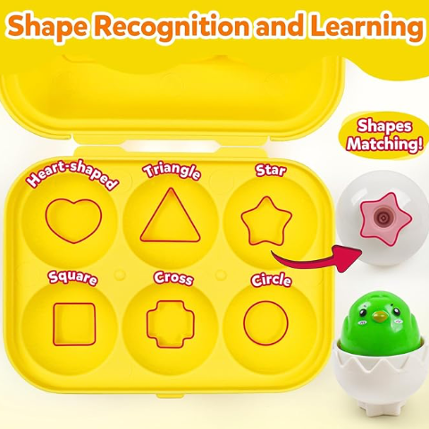 Setul include și forme geometrice de bază, pe care copiii le pot potrivi în carcasa ouălor, învățând astfel forme precum cerc, stea sau triunghi.