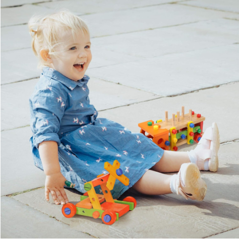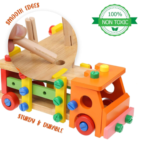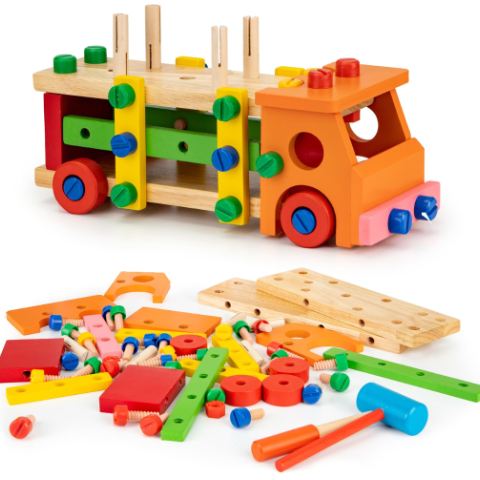 Camionul multifuncțional din lemn este o jucărie educativă care stimulează creativitatea și coordonarea motorie a copiilor.