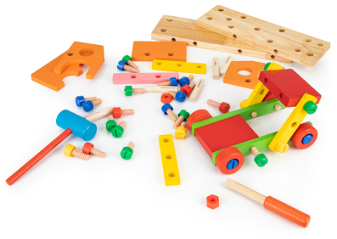 Acest set include un ciocan, șurubelniță și o gamă variată de șuruburi și piese colorate care pot fi asamblate și dezasamblate.