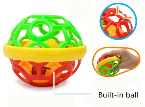 Interiorul mingii ascunde o surpriză: bilele care fac zgomot, atrăgând atenția copilului și încurajând explorarea.
