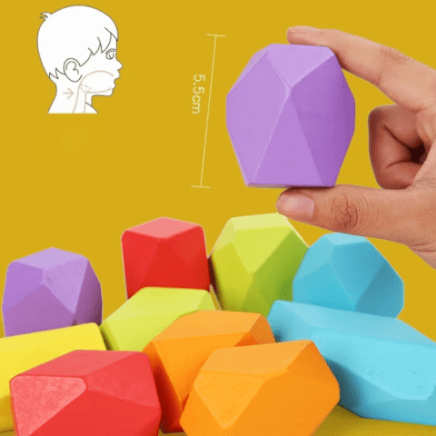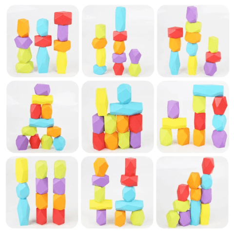 Fiecare copil descoperă bucuria echilibrului construind turnuri creative cu forme neregulate și culori vii.