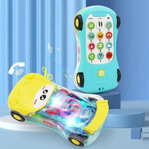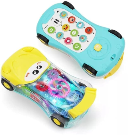 Telefonul funcțional oferă sunete atractive și opțiuni de joc, în timp ce mașinuța transparentă dezvăluie un mecanism de rotițe colorate care se mișcă atunci când vehiculul este pus în acțiune.