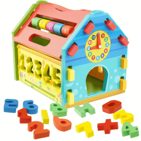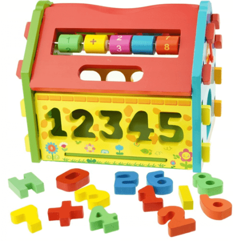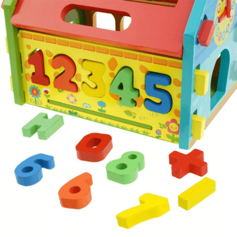 Baza conține un sortator cu cifre minuscule din lemn care trebuie introduse corect, dezvoltând logica și coordonarea mână-ochi.
