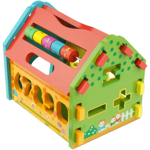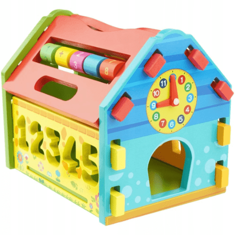 Această căsuță colorată din lemn este un adevărat centru de activități pentru copii mici, combinând joaca cu învățarea.