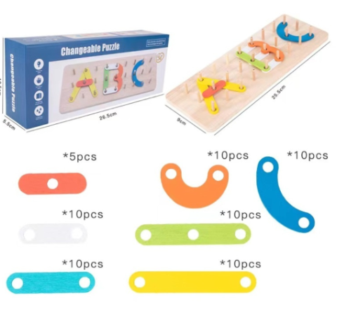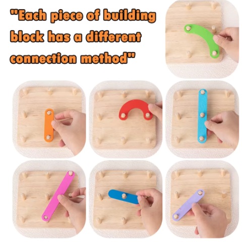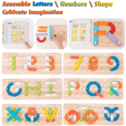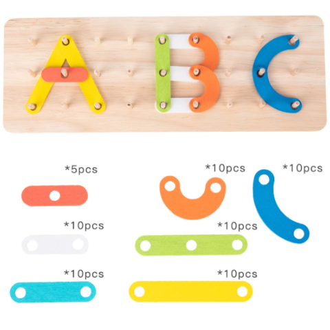 Piesele colorate și flexibile permit copiilor să creeze litere, cifre și forme diverse pe placa din lemn cu pini.