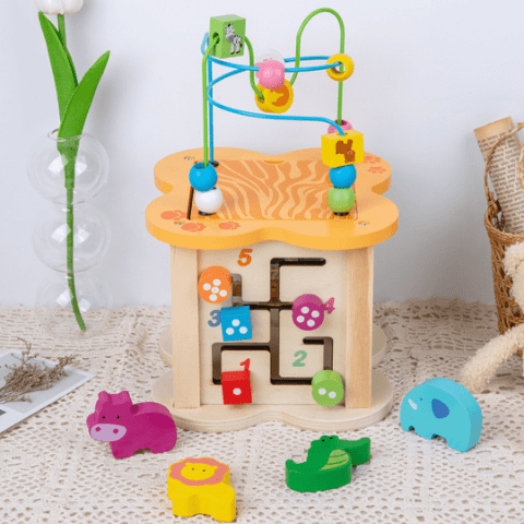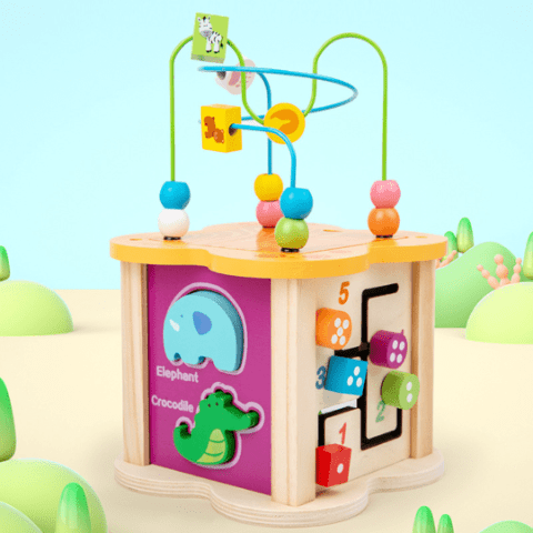 Cubul educativ din lemn oferă multiple activități care stimulează logica, motricitatea și curiozitatea celor mici.