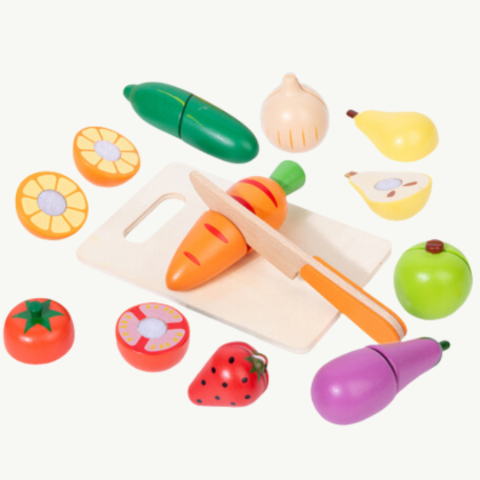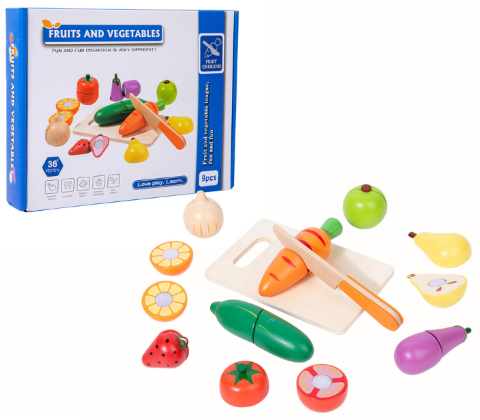 Fiecare fruct și legumă este împărțit în două părți, care se unesc cu ajutorul unui Velcro puternic, oferind senzația de tăiere realistă atunci când se folosește cuțitul din lemn inclus.