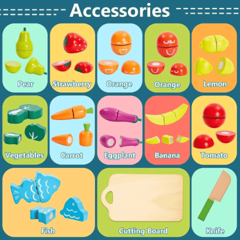 Este o jucărie Montessori educativă, perfectă pentru învățarea culorilor, formelor și a rutinei zilnice de gătit.