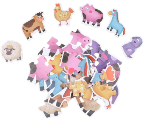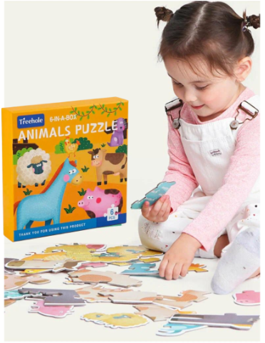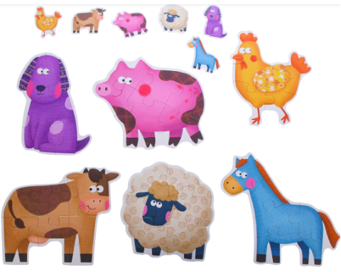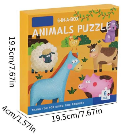 Puzzle-urile sunt ilustrate cu animale de fermă prietenoase și colorate vesel, ajutând copiii să își dezvolte abilitățile motorii fine și gândirea logică.