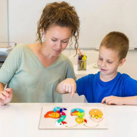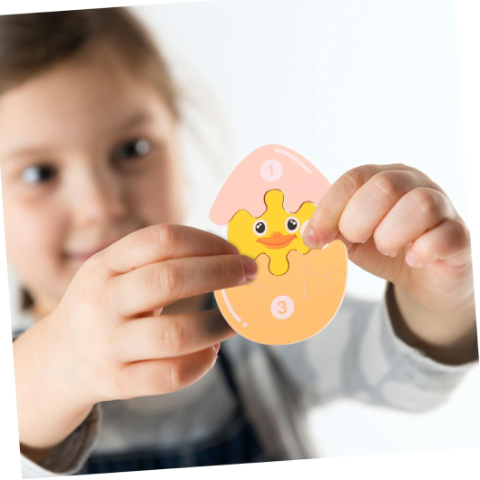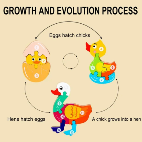 Acest puzzle educativ din lemn îi ajută pe cei mici să descopere procesul fascinant al evoluției unei rățuște, de la ou la adult.