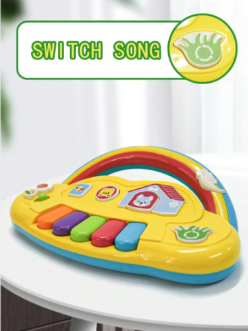 Acest pian adorabil cu design curcubeu atrage atenția bebelușilor datorită culorilor vibrante și formelor prietenoase.