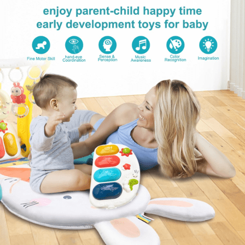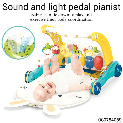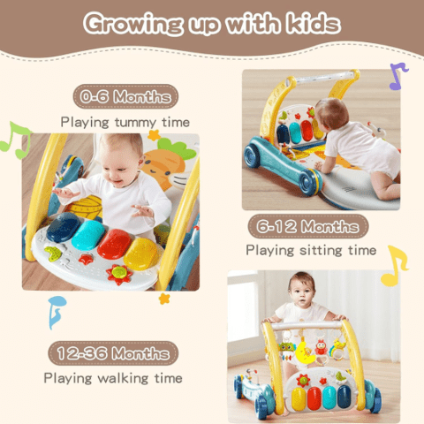 În primele luni, micuțul se va bucura de sesiuni interactive de stat pe spate, activând sunetele și luminile de la pianul reversibil cu piciorușele.