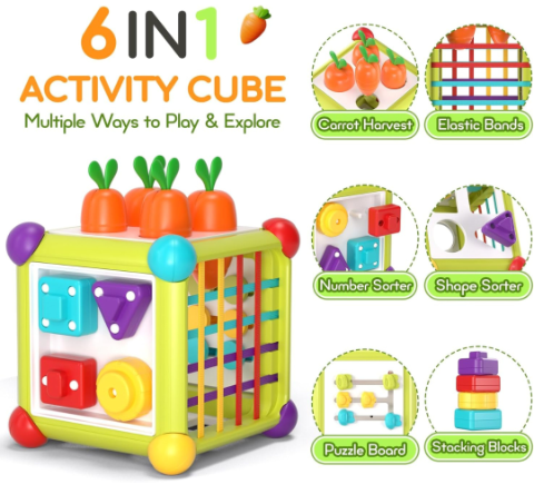 Cubul de activități 6 în 1 oferă multiple moduri de joacă și învățare pentru cei mici.