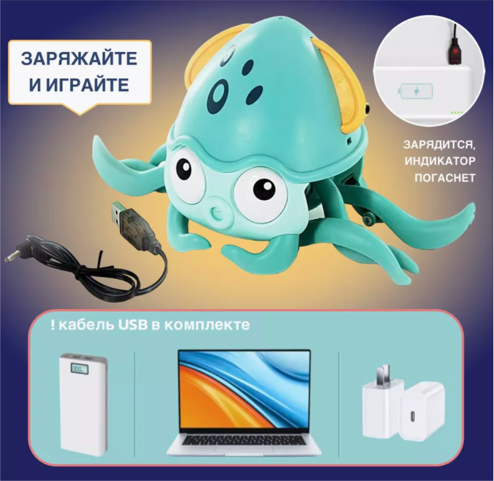 Alimentată printr-un cablu USB inclus, caracatița poate fi reîncărcată ușor, fiind pregătită pentru noi aventuri.