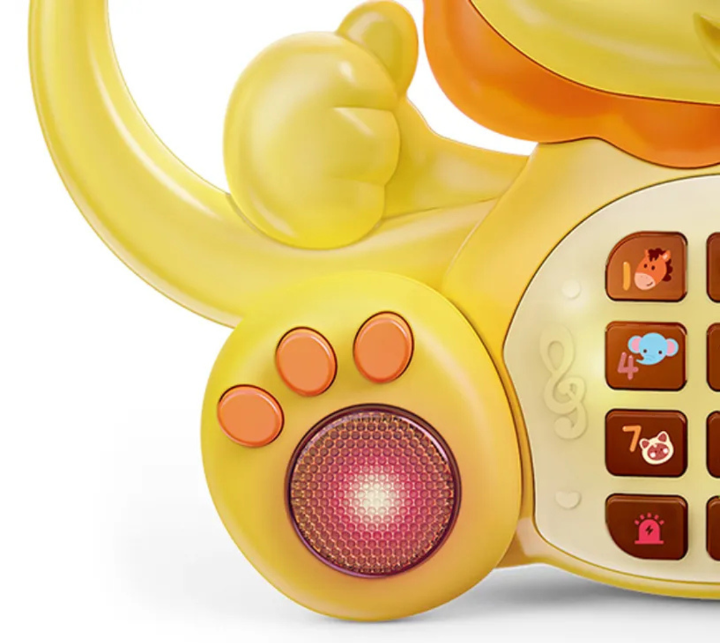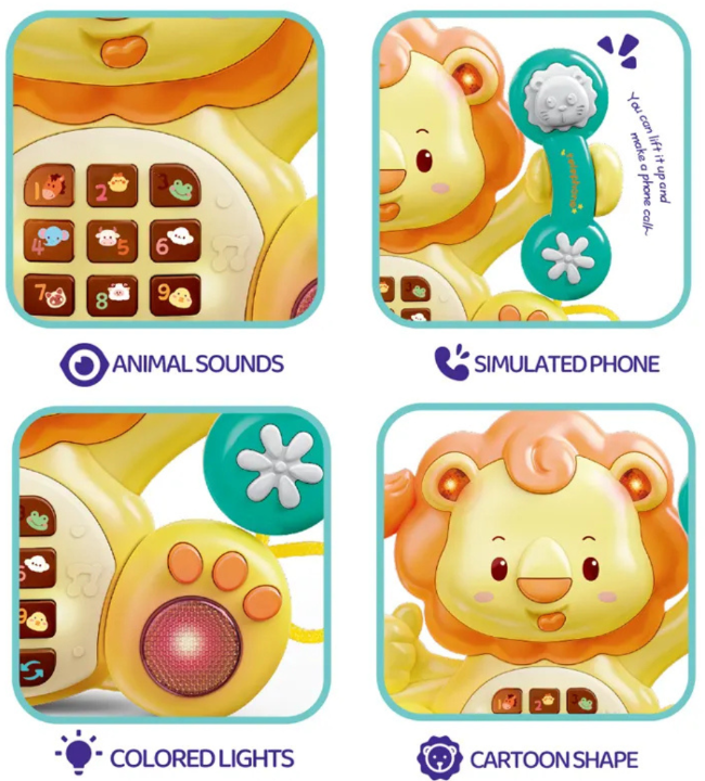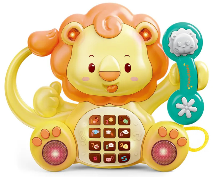 Telefonul muzical pentru bebeluși în formă de leu aduce bucurie prin sunete vesele și lumini colorate, stimulând curiozitatea celor mici.