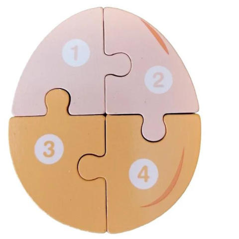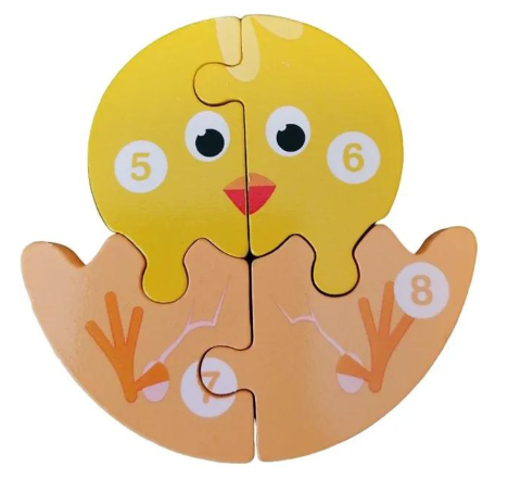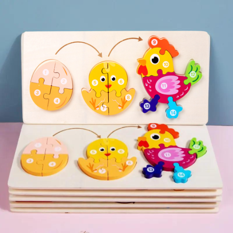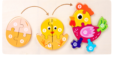 Puzzle-ul ajută copiii să descopere ciclul de viață al găinii, pornind de la ou, continuând cu puiul și terminând cu găina adultă.