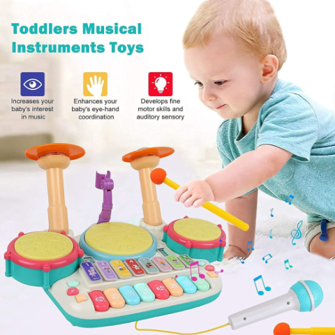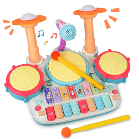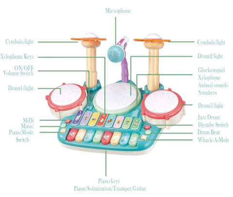 Setul de tobe și pian interactiv este ideal pentru micii muzicieni dornici de explorare sonoră.