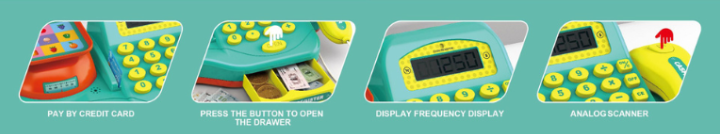 Setul conține 18 piese, inclusiv o casă de marcat cu butoane funcționale, un scanner analog, card de credit și bani falși pentru tranzacții realiste.