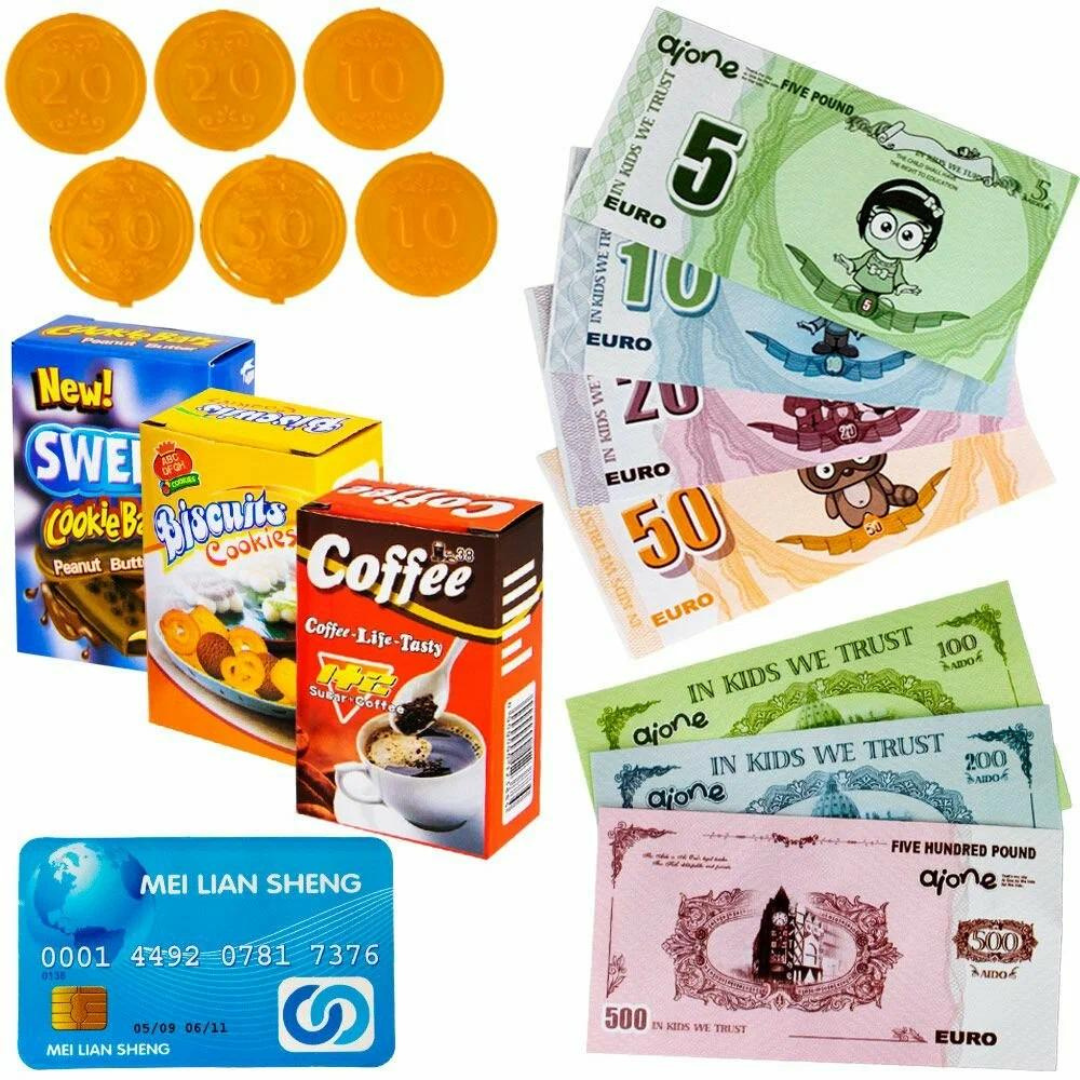 De asemenea, sunt incluse cutii de produse și monede de plastic, toate contribuind la dezvoltarea abilităților matematice și sociale ale copiilor prin joc de rol.
