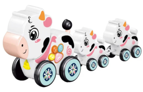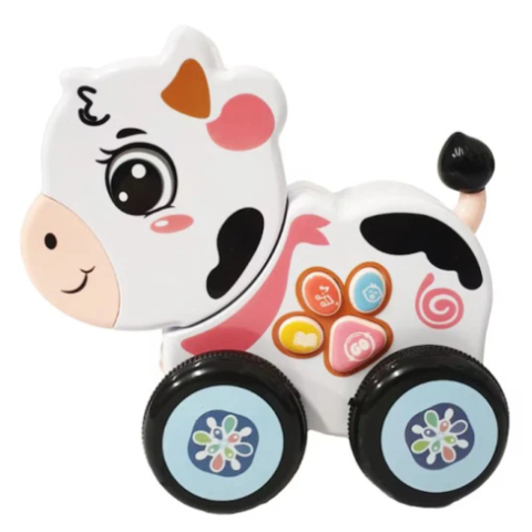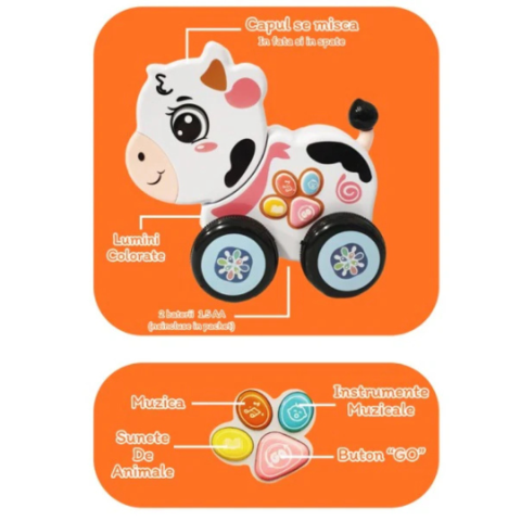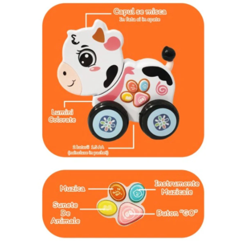 Jucăria cântă melodii încântătoare și redă sunete de animale care stârnesc curiozitatea copiilor.