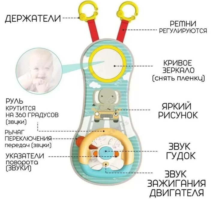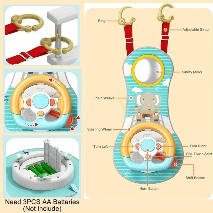 Fixați-l pe spătarul scaunului din față și copilul se poate juca „conducând” în timp ce înveți și explorează lumea în timpul drumurilor lungi.