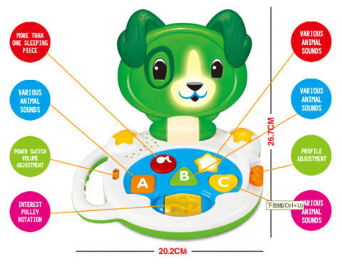 Fiecare buton declanșează melodii vesele, sunete de animale sau lecții simple despre litere și forme.
