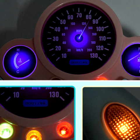 Ecranul simulează indicatoarele de viteză și luminile de bord, stimulând imaginația și încurajând creativitatea.