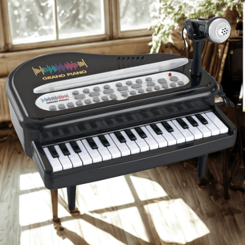 Pianul electronic Grand Piano îi invită pe micii artiști să exploreze sunetele prin 8 acompaniamente clasice, 5 efecte de tobe, 8 instrumente diferite și 7 melodii demonstrative care transformă fiecare sesiune într-un spectacol complet.