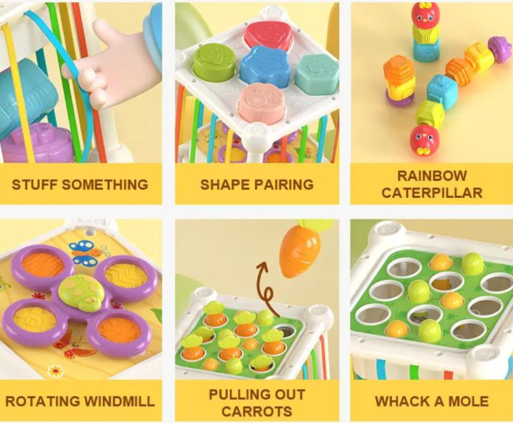 Cubul multifuncțional educativ oferă o gamă variată de activități interactive pentru dezvoltarea abilităților motrice și cognitive ale copiilor.